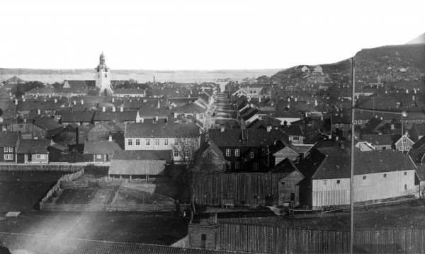 Kristiansand square seen from Baneheia in 1871. Markensgaten runs from Tordenskjolds gate to Østerhavnen, shown in the middle of the picture. Tordenskjolds gate 24, the large house in the middle of the photograph, still exists today. The church building with the tower on the left side of the photograph is the cathedral, which was built in 1738.The cathedral burnt down in 1880. On the far left you can see Christiansholm fortress with a pointed roof, and on the far right the hospital buildings on Odderøya. At the bottom of the picture we see a bit of the roof of the old rope factory.