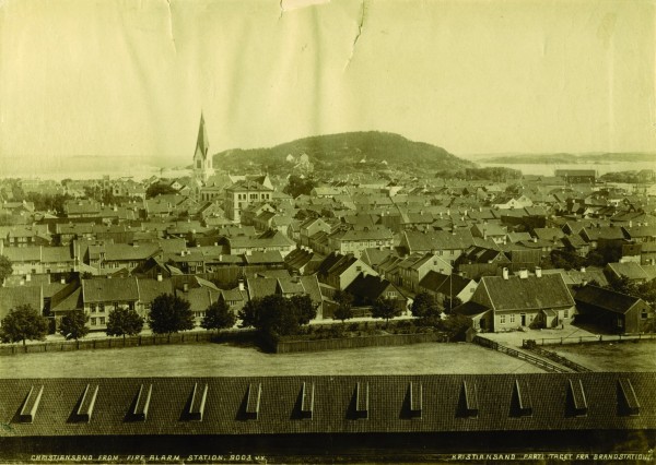Kristiansand-Stadtzentrum (auch „Kvadraturen“ genannt, wegen seiner quadratischen Anordnung der Strassen) von der Baneheia aus gesehen 1871. In der Bildmitte verläuft die Markensgate /Markens-Strasse/(Haupt-Einkaufs-Strasse) von der Tordenskjolds gate/Tordenskjolds-Strasse zum Østerhavnen/Ost-Hafen. Das große Haus in der Mitte des Fotos ist das Haus in der Tordenskjolds-Strasse mit der Hausnummer 24, das heute noch existiert. Das Kirchengebäude mit Turm links im Bild ist die Domkirche von 1738, die 1880 abbrannte. Ganz links im Bild kann man die Festung Christiansholm mit seinem Spitzdach erkennen, ganz rechts im Bild die Lazarettgebäude auf Odderøya. Im Vordergrund des Bildes sieht man ein Stück vom Dach der damaligen Reperbanen/Taue-, Leinen-, und Trossen-Fabrik.