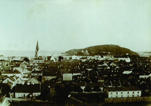Kristiansand square seen from Baneheia in 1871.  Markensgaten runs from Tordenskjolds gate to Østerhavnen, shown in the middle of the picture. Tordenskjolds gate 24, the large house in the middle of the photograph, still exists today. The church building with the tower on the left side of the photograph is the cathedral,  which was built in 1738.The cathedral burnt down in 1880. On the far left you can see Christiansholm fortress with a pointed roof, and on the far right the hospital buildings on Odderøya. At the bottom of the picture we see a bit of the roof of the old rope factory.